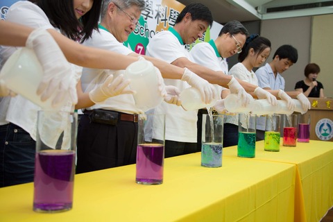將清澈透明的「宜蘭水」與果汁緩緩倒入量筒,再放進急速冷凍盒裡快速搖動,立即變成清涼消暑的果汁冰棒!中華民國第54屆中小學科學展覽10日舉辦展前記者會,國立台灣科學教育館館長朱楠賢現場示範利用科學原理自製冰...