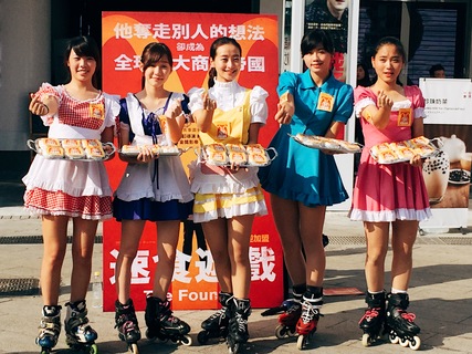 直排輪溜冰辣妹,重現40年代美式速食餐廳風貌,當街請民眾吃漢堡!電影《速食遊戲》片商於2日下午邀請多位短裙辣妹溜冰員在西門町街頭端起餐盤、表演花式溜冰,並送出上百個免費漢堡,吸引現場民眾合照打卡,展現早期...