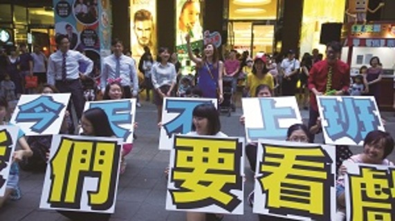 「今天不上班,我們要看戲!YA!」3日下午,一群帥哥美女輕鬆打扮聚集在信義新光三越廣場,手拿水槍及麥克風,用最純美聲的A Cappella無樂器伴奏,唱起<無樂不作>,及<when you open yo...