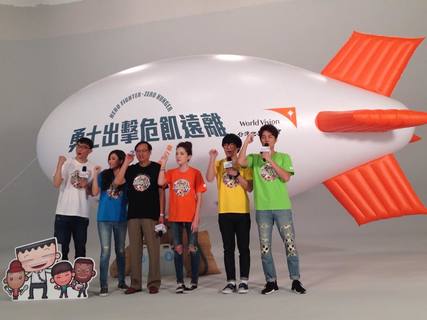 藝人A-Lin、吳克群、許瑋甯及盧廣仲, 分別身穿藍、綠、橘、黃T-恤,代言世界展望會第27屆飢餓三十「Hero Fighter, Zero Hunger 勇士出擊,飢餓遠離。」的活動,他們的T-恤上畫的...