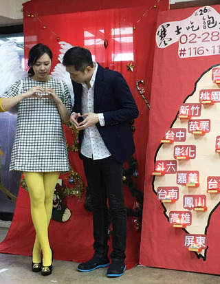 揹著天使翅膀出場的藝人洪百榕,象徵報佳音的天使,與丈夫宋達民一同擔任今年創世基金會的幸福大使,兩人一起點亮創世基金會將舉辦寒士尾牙宴的全台16縣市燭光。宋達民15日引用聖經中「施比受更為有福」並回憶說,「...