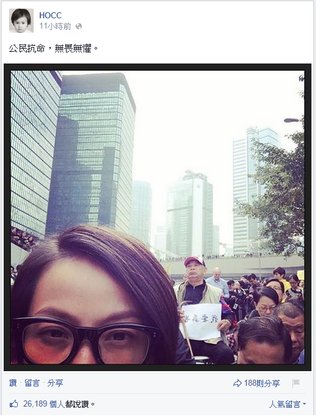 香港佔中運動清場之際,曾入圍金曲獎最佳國語女歌手的香港歌手何韻詩,不但到金鐘佔領區與學生站在同一陣線,並在臉書放上靜坐現場照片,附上「公民抗命,無畏無懼。」八個字,以示支持佔中決心。 被捕稍早前,何...