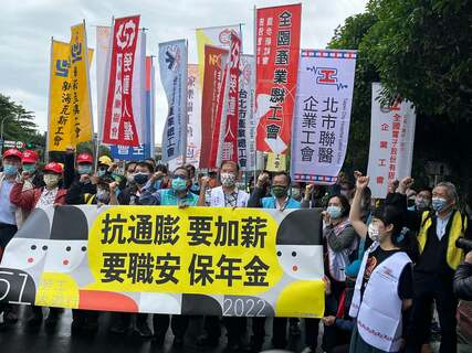 顏色各異的工會旗幟聳立於凱道,隨著五一勞動節將近,提出「抗通膨、要加薪、要職安、保年金」4大訴求!因應疫情升溫,每年固定舉行的五一大遊行改為定點集會,數十名勞工20日到行前記者會握拳疾呼四大口號,要求政府...