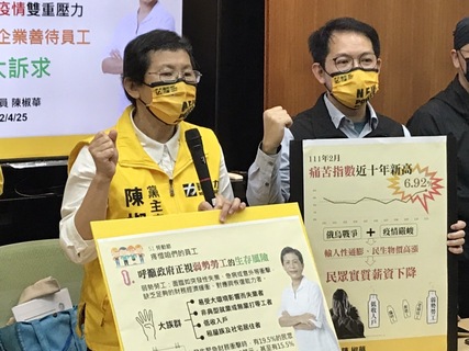 通膨疫情重壓弱勢勞工,外送員防疫也沒保障!時代力量立委陳椒華25日於記者會表示,如零工、無業者或租屋族等弱勢勞工在面對疫情、通膨等突發狀況時,政府應以補助等的方式協助他們度過難關。全國外送產業工會理事長陳...