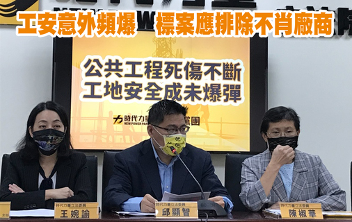 營造業平均2.6天就一場死亡意外!時力立法院黨團邀民團30日於立法院召開「公共工程死傷不斷 工地安全成未爆彈」記者會,時代力量立委陳椒華指控,台灣公共工程死亡數十年超過400人,卻未見政府重視。立委邱顯智...
