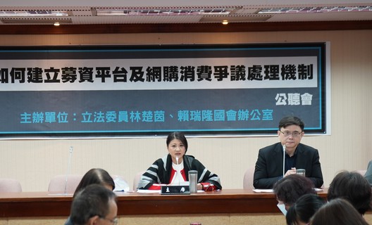 「群募平台爭議四起,應成立主管機關!」立委林楚茵、賴瑞隆15日舉辦「如何建立募資平台及網購消費爭議處理機制」公聽會,指出出貨延遲等募資平台常見爭議,邀請業者報告爭議處理機制,並請法務局分享案例,指出目前募...