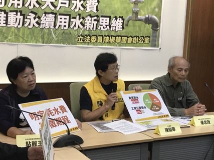 「不能只靠人民納稅錢作停灌補貼,應儘速開徵耗水費!」立委陳椒華4日指出,2016 年《水利法》增訂「耗水費」條款,針對每月用水量大於1000度的用戶,附徵10~30%的水費,但至今仍未依法開徵,呼籲政府儘...