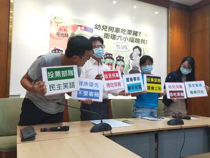 「衛福部對於萊豬健康風險評估尚未完成,在衛環委員會的民進黨立委須負起監督責任!」民間反瘦肉精毒豬聯盟6日呼籲衛福部針對萊豬的健康風險評估尚未完成,民進黨立委也需要負起監督責任,不可強行開放萊豬。在場的精神...