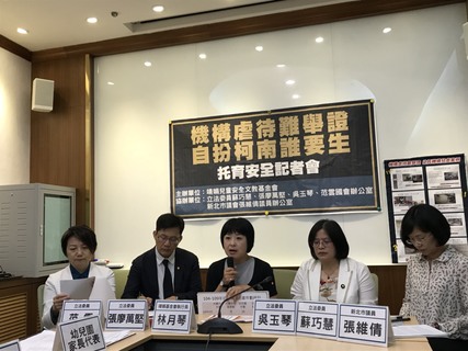 幼托機構兒虐難舉證,應全面加裝監視器!靖娟兒童安全文教基金會與立委蘇巧慧、張廖萬堅、吳玉琴、范雲及議員張維倩12日召開記者會,靖娟基金會執行長林月琴指出,舉證幼托機構虐待非常困難,且政府接獲通報及處理流程...
