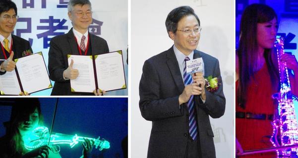 表演者手持的特製夜光大、小提琴,配合著絢爛的燈光變化,演奏出中西合璧的悠揚樂曲。為發揮產學鏈結效果,科技部14日宣告,「運用法人鏈結產學合作計畫電子資通訊」計畫正式啟動。開場的提琴表演,就象徵著藝術人文、...