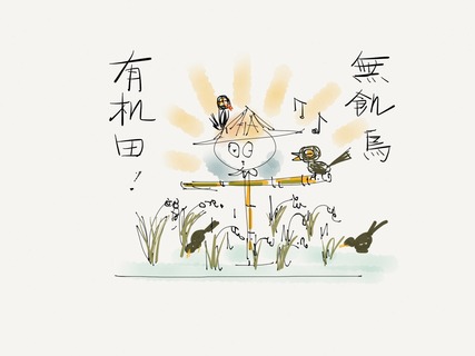 我小時候在鄉下老家最大的樂趣,就是跟阿公阿嬤到田裡去,趁他們忙不過來時,跟田裡的稻草人聊天。他的身體是修路時會擺放的假人,一副成年帥哥的臉,穿著「施工危險」的制服,還戴著斗笠, 用底下一根掃把柄表演金雞獨...
