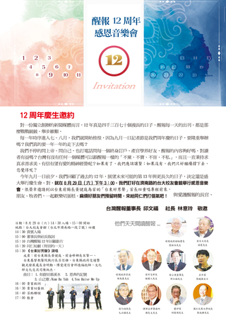 台灣醒報走過12年歲月,最適合紀念的是辦一場感恩音樂會,8月29日(六)下午3:00,希望喜歡醒報的讀者們都現身,與同仁一起吃喝、慶賀。 社慶演唱會主要的節目,是由2015年1月由台東縣長黃健庭發起...