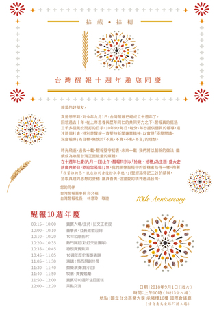10週年社慶忙完,已經過一週了,到現在才喘口氣,可以跟讀者分享一些感恩的話與感想: 1.讀者們對台灣醒報的支持,令我們深深感動,為了慶賀醒報10週年,不論是捐款、出席、致送花籃、還是寫祝福期勉的話,...