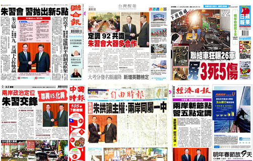 國民黨主席朱立倫與中共中央總書記習近平4日在北京人民大會堂會面,成為《台灣醒報》、《聯合報》、《中國時報》、《自由時報》及《經濟日報》等5報5日的頭版頭條。《台灣醒報》頭版頭條報導,朱立倫希望在「一中各表...