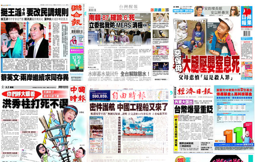 南韓87確診6死,立委批我國MERS防疫消極成為《台灣醒報》9日頭版頭條。挺王金平派中常委預計10日提案要改民調規則,以阻洪秀柱氣勢,則是《聯合報》頭版頭條。而《中國時報》頭版頭條則報導王金平一句「義不容...