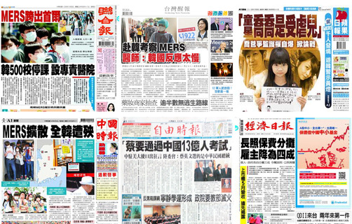 MERS病毒肆虐韓國,疾管署派醫師赴韓回國報告指出,韓方反應慢,民眾未全面警覺成為《台灣醒報》4日頭版頭條。民進黨總統參選人蔡英文訪美受到當局政府高度禮遇,引起中國駐美大使崔天凱嚴批則是《自由時報》的頭版...