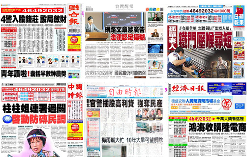 網路文章涉有廣告嫌疑,法律認定模糊成為《台灣醒報》26日頭版頭條。次條立法院副院長洪秀柱完成黨內總統初選連署查核程序,黨中央決議將啟動「防磚機制」則是《中國時報》的頭版頭條,文中指出,若洪的民調支持度可跨...